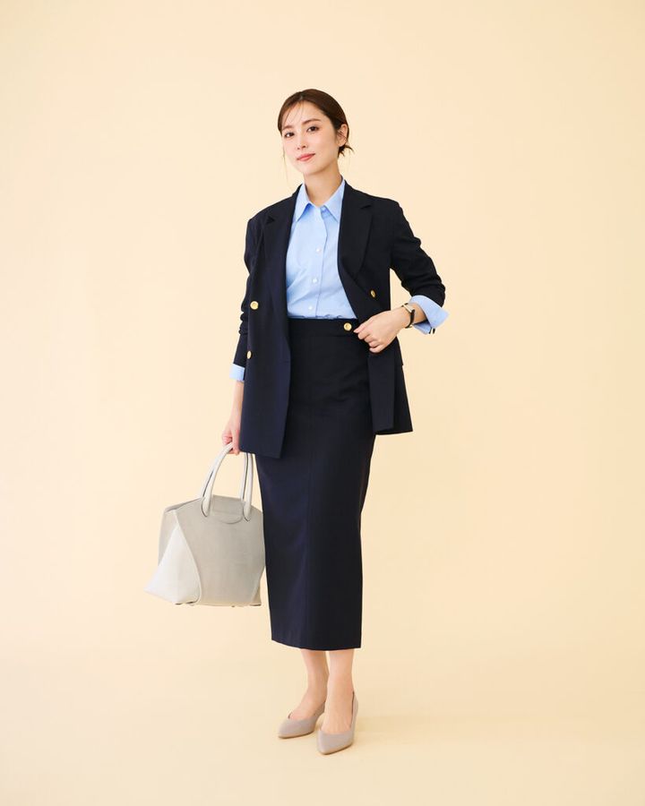 世界を相手にするビジネスのため、仕事が深夜にまでおよぶ日も多く、柔軟かつ根気よく仕事に向き合うことが求められる商社。紺ジャケットを使った知的な着こなしで、タフなマインドを示したい。ジャケット¥21,890スカート¥13,090(ともにホワイト/スーツスクエア TOKYO GINZA店)シャツ¥23,100(ユナイテッドアローズ/ユナイテッドアローズ 丸の内店)バッグ¥59,400(トフ&ロードストーン/T&L)パンプス¥20,350(ピシェ アバハウス/アバハウスインターナショナル オンラインストア)ネックレス¥85,800(ココシュニック)時計¥19,800(カンポ マルツィオ/クラスフォーティーン)