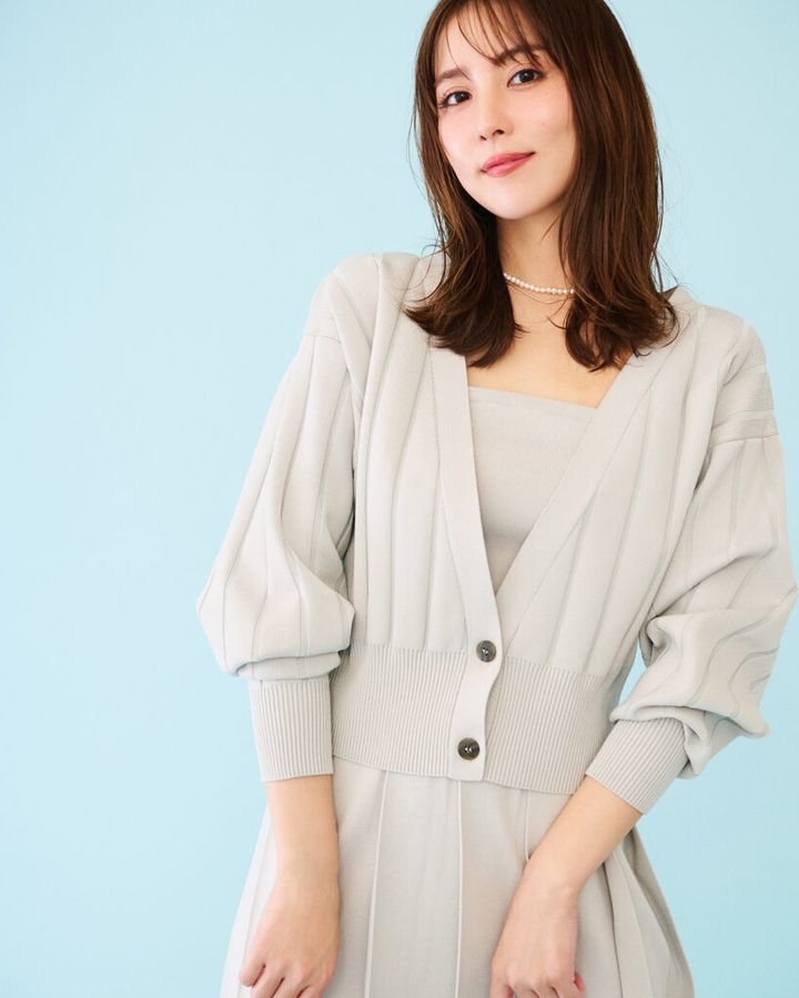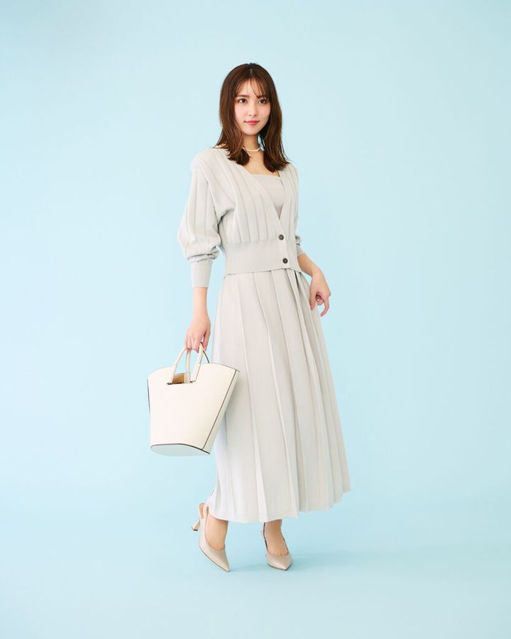 入社後も大活躍しそうなニットのセットアップに小ぶりのパールネックレスを合わせて、品よくまとめて。袖を少し捲り上げると、オシャレな抜け感が生まれると同時に、軽快さも手に入ります。