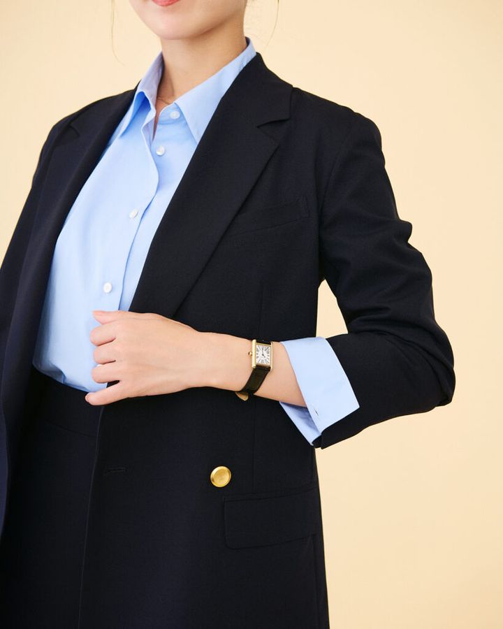 ジャケットの袖を捲り、インナーのシャツをひと折り分アウト。ネイビー×ライトブルーの爽やか配色を手元でもつくれば、ぐっとスマートな印象に。