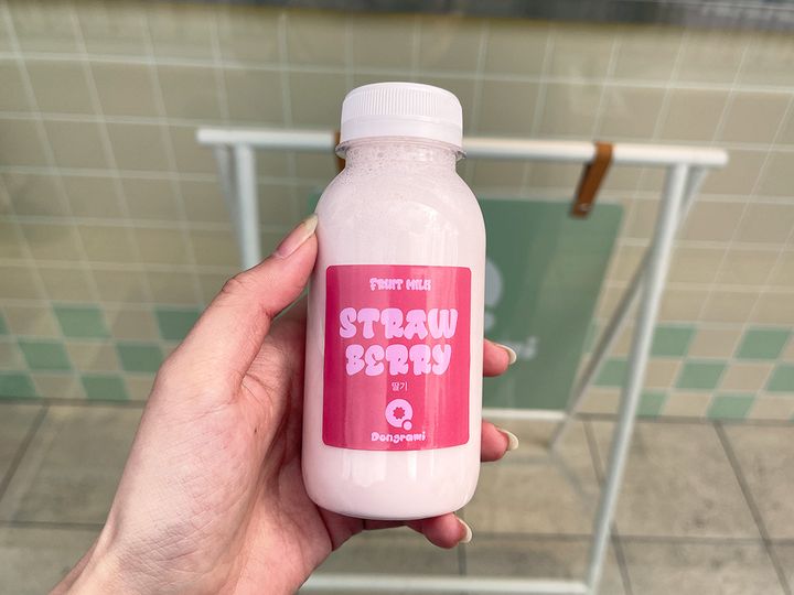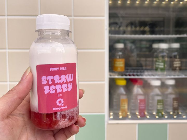 「ドングラミセット」についてくるミルクドリンクに使用されているのは、新鮮な北海道産のミルク。中に入っているフルーツは、韓国から取り寄せることもあるのだとか。