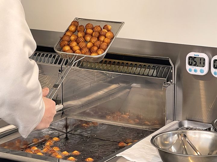 チュロスボールは、注文が入ってから揚げてもらえます。まるで油の中を泳いでいるかのような姿がかわいい♪