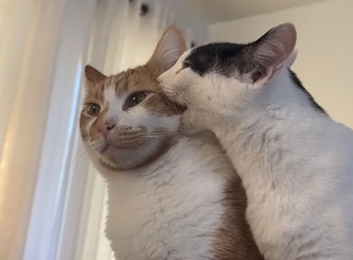 新しいスタイルの毛繕い? 同居猫さんのほっぺをハムハム!