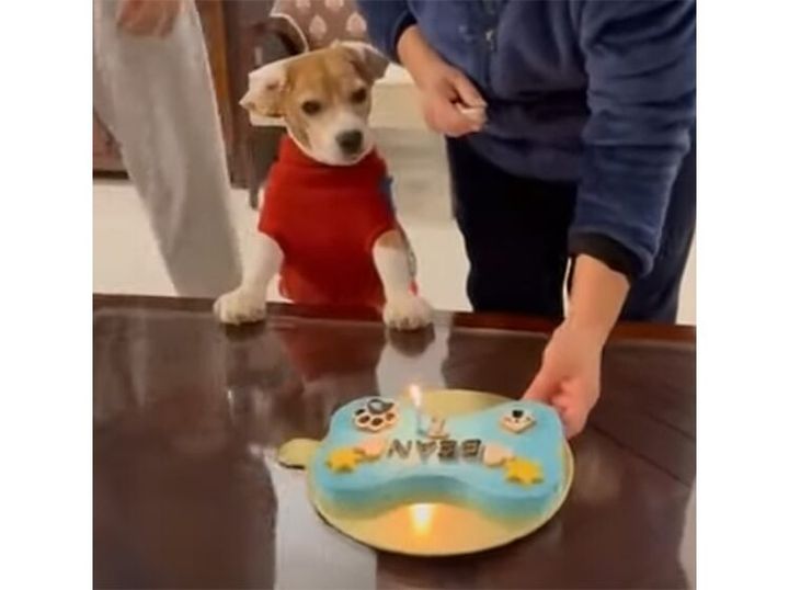 いつもとは違うおやつ! お誕生日ケーキに喜ぶ犬さん。
