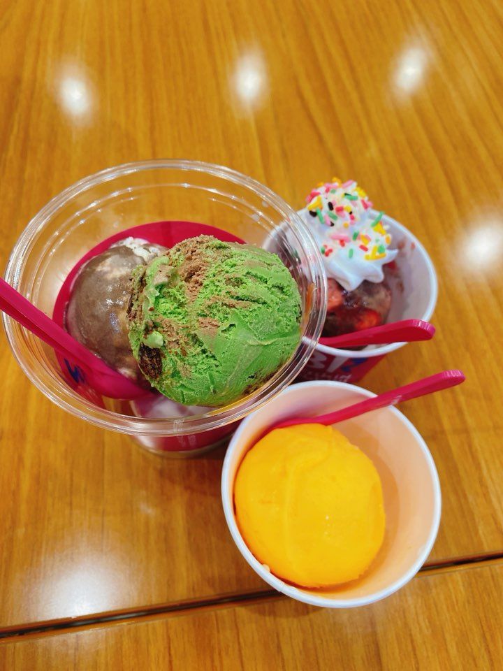 こちらは大人気なく【春の選べるクーポン券】使ってトリプルにした私のアイスと31パスポートのトッピングをもらった娘のアイスと息子のお気に入りのオレンジソルベ‪☆