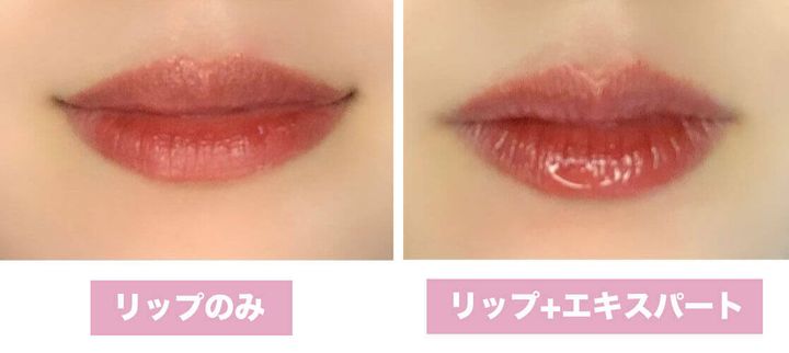 リップの上から「エキスパート」を塗ってみたところ、ボリュームと光沢感が生まれました。カラーも一層きれいに発色します♡(リップカラーにはLakaフルーティーグラムティントを使用、ティッシュオフしました)