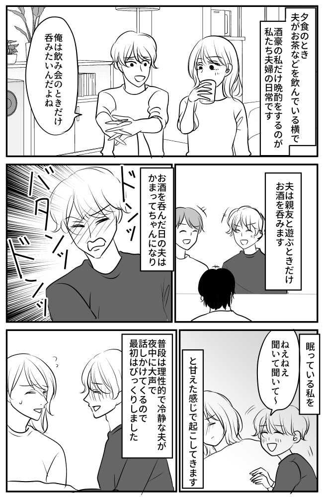 お酒を呑んだ日の夫は、かまってちゃんになって帰ってきます。夜中、帰ってくるなりドタバタとにぎやかな音を立てて壁にぶつかりながら寝室へ飛びこんできて、眠っている私を起こしてきます。普段、理性的で冷静な夫が夜中に大声で話しかけてくるので、最初はびっくりしました。