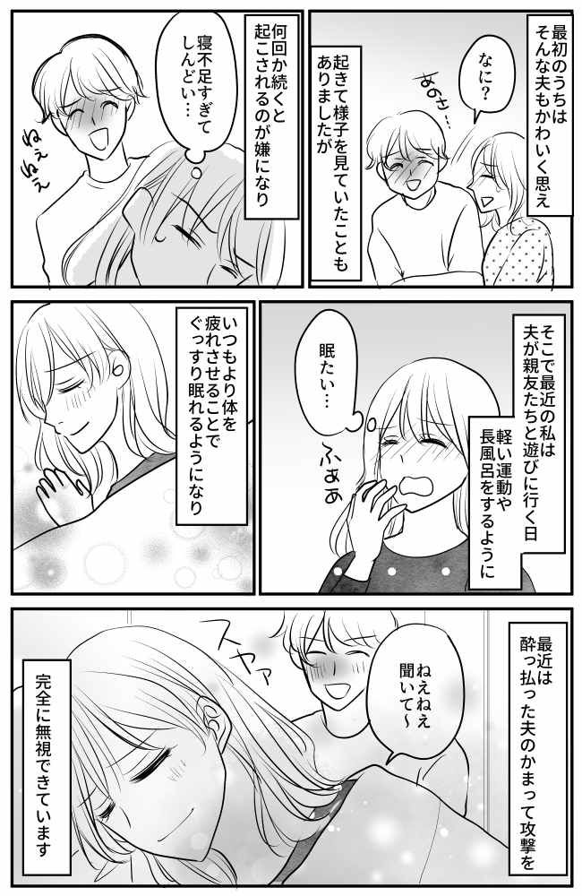 そこで私が考えついた対策は、「軽い運動や長風呂をして体を疲れさせる」というものです。夫が呑んで帰ってくる日は、ぐっすりと深い眠りにつけるようにしてから布団へ入ることで、最近は酔っ払った夫のかまって攻撃を完全に無視できています。