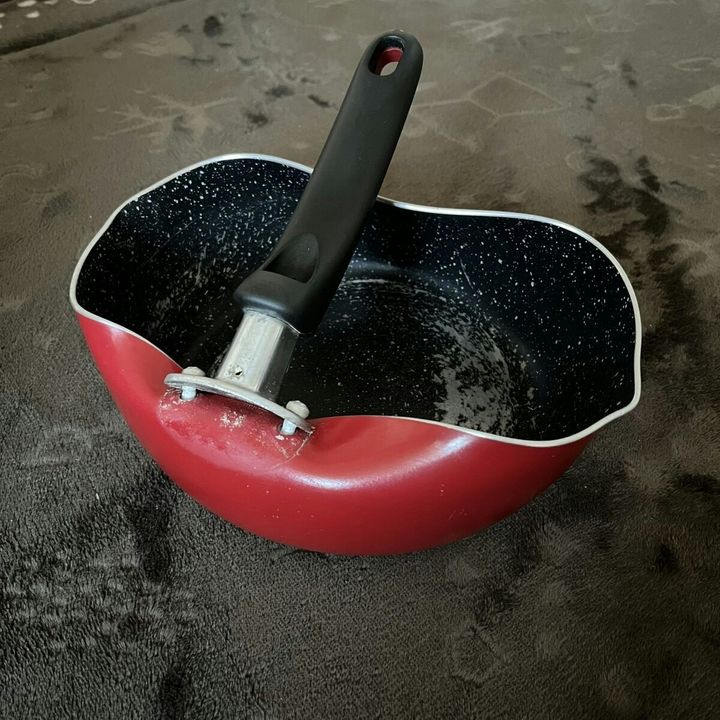 不燃ごみの規定サイズを微妙にはみ出てしまったフライパン。「粗大ごみで出すしかないか」としょげてしまったというふくまめさん。そんな様子を見た夫、なんと手でフライパンを曲げたそう。確かにこれなら規定のサイズには収まっていますよね。