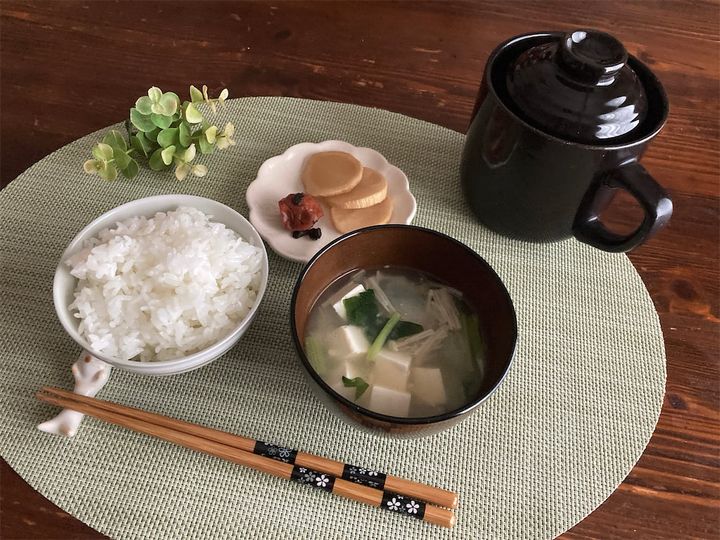 炊き立てのご飯に、漬物&梅干し(共に市販)と手作りのみそ汁を添えれば、簡単ご飯の出来上がり。