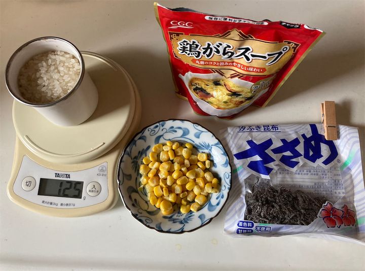 とうもろこしは大さじ2杯分入れたかったので、お米大さじ2杯分(25g)を1合分から引き、水の量を180mlから150mlに変更しています。