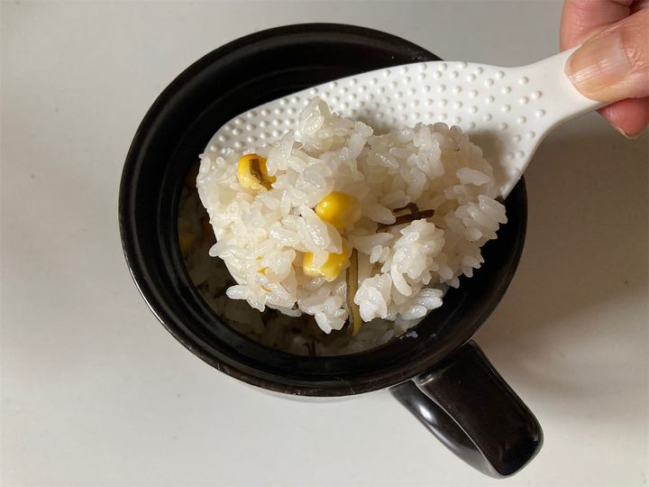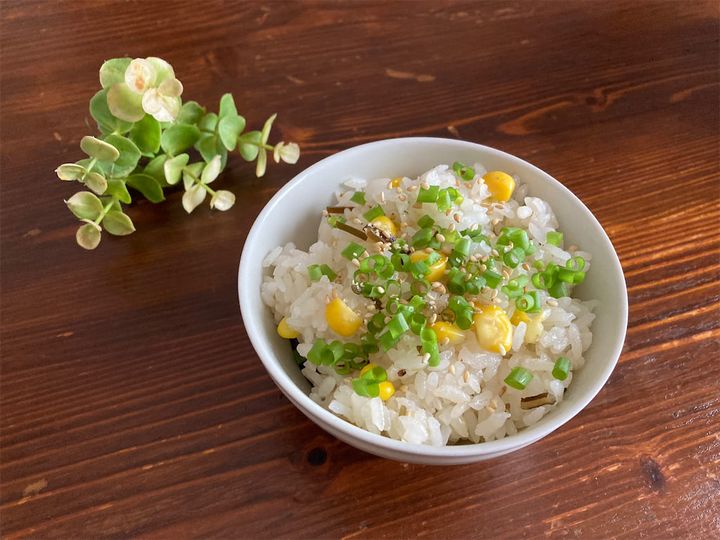 ふっくら炊けたご飯に、塩昆布のほどよい塩味にとうもろこしの甘みがマッチして、止まらないおいしさです♡
