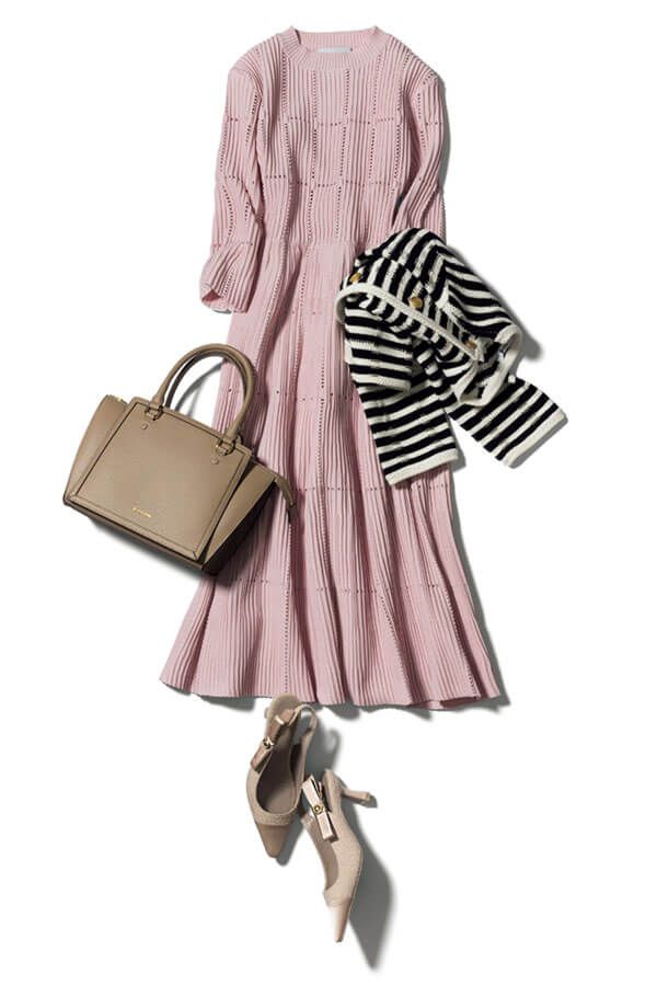 カットワークとプリーツのような縦線で模様を表現したニットワンピは、ニュアンシーな色出しにも個性が。ボーダーでピンクの甘さをほどよく抑えれば、通勤シーンもおまかせ。帰りは肌寒さにそなえて、アウター代わりにカーデがあると安心です。