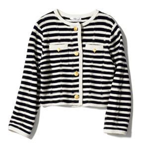 この春気になるマリンなテイスト演出はおまかせ。ジャケットのきちんと感と、ニットのラクな着心地を両立。柄と金ボタンがマリン味です。