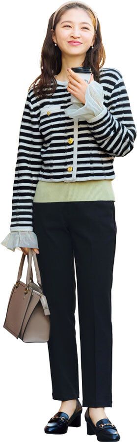 凛としたパンツルックだからこそ、甘ディテールが大人可愛いポイントに。通勤に活躍するシンプルな黒パンツもボーダーで真面目すぎない印象に。