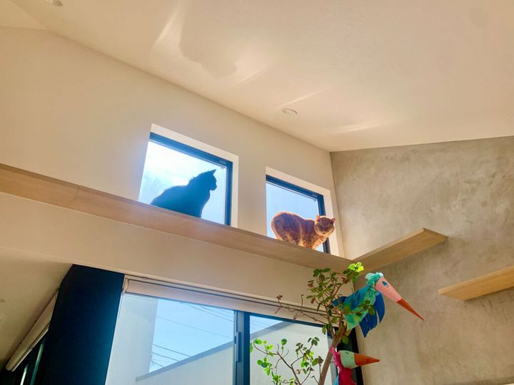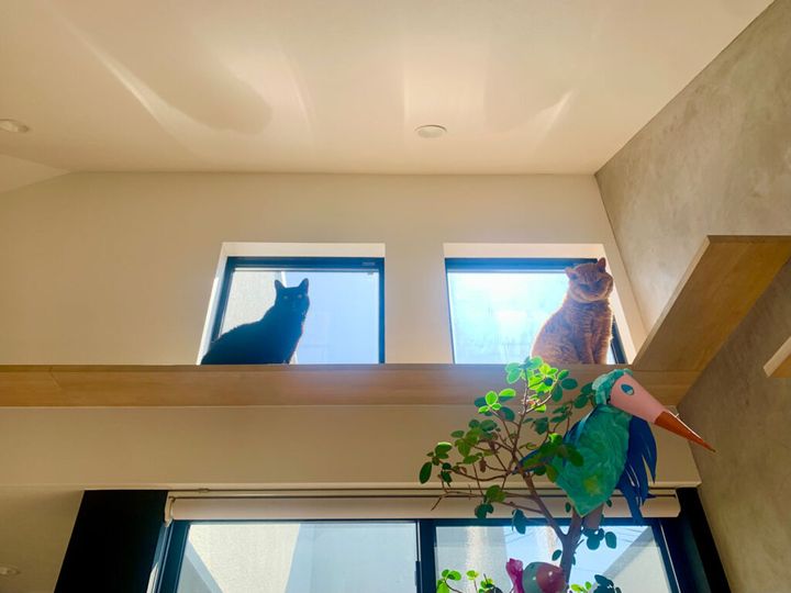 ギネスです。朝はピムスと、キャットウォークの窓からニャルソックしてます。この窓は、ぼく用、ピムス用と1枚ずつ設計士さんがこだわって作ってくれた特別なものなんです。