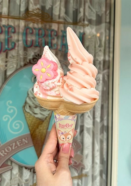 まずコーンの形にびっくり!受け皿部分が二手に分かれたユニークな形になっていて、濃厚なミルクとさっぱり白桃味の2種のソフトクリームが盛られています。『ダッフィー&フレンズ プレイ・デイズ』のコンセプトでもある「幸せをシェア」できるアイスなので、友達や彼、家族でシェアしながら食べるのにぴったり♪(HK$68)