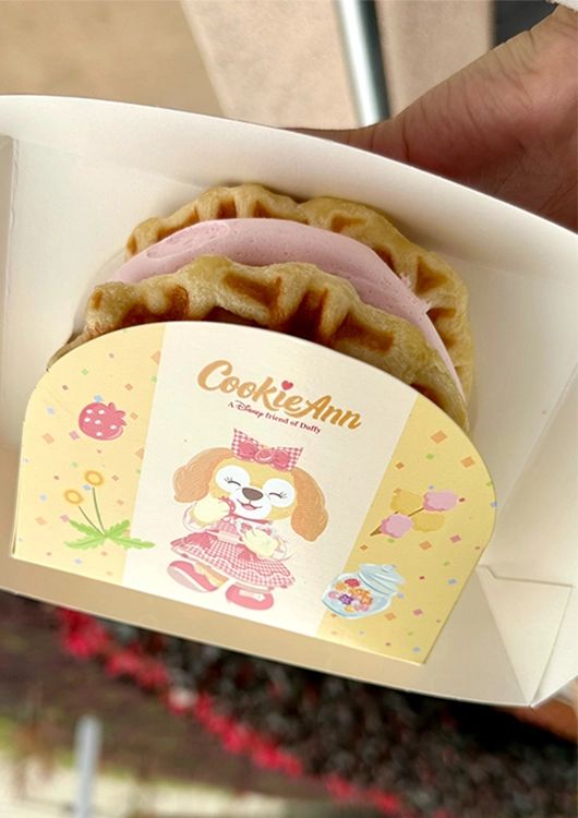 クッキー・アンとダッフィーの出会いのストーリーをモチーフにしたような、ワッフルのスイーツ。大きめのワッフルの間には見た目も可愛いピンクのふかふかなマシュマロが挟まれていて、超ボリューミィ!パッケージには、苺を食べる姿がキュートなクッキー・アンのイラストが♡ (HK$58)