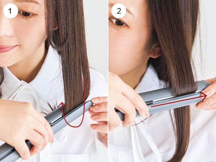前髪とフェイスラインの髪の中間あたりを合わせてアイロンで挟み、外側に流せば顔周りの毛流れの完成。