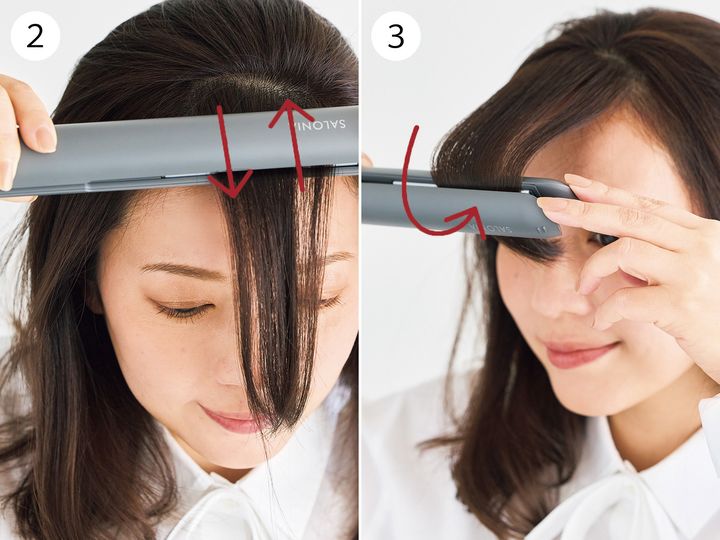 2で根元をのばしたら、前髪の毛束をおでこから浮かせてアイロンを毛先まで滑らせて。内巻きにしながら抜いて毛先に少し丸みを。