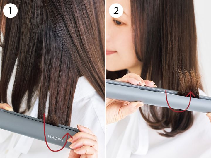 ①後ろの毛束を中間から挟んで下に滑らせ、毛先を外側に向かってワンカールさせて外ハネに。②サイドの毛束も1と同様にワンカールの外ハネに。毛束は髪の表面側と内側に分けてから挟むと毛先のカールが重なり合い、より立体感のある仕上がりに。