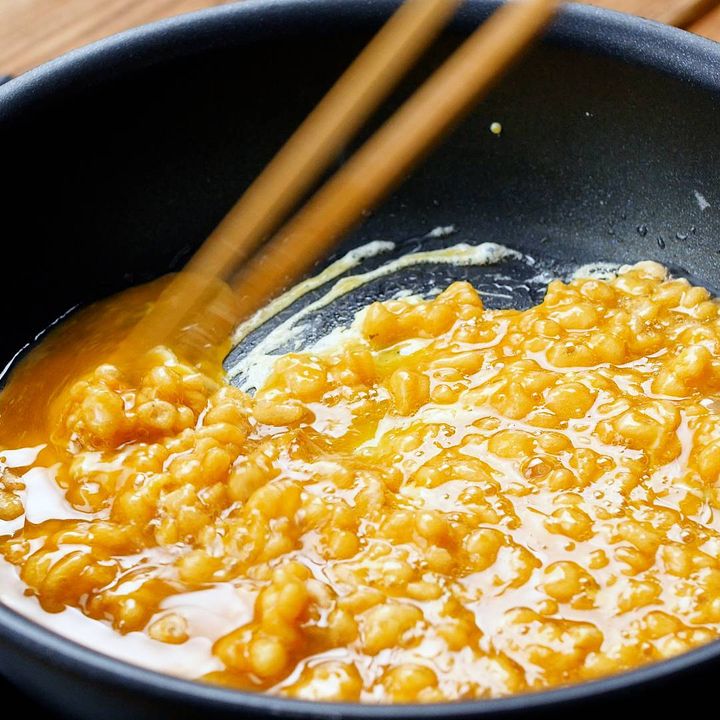 2: フライパンにサラダ油を引いて熱し、①を入れてかき混ぜながら半熟状になるまで炒めます。