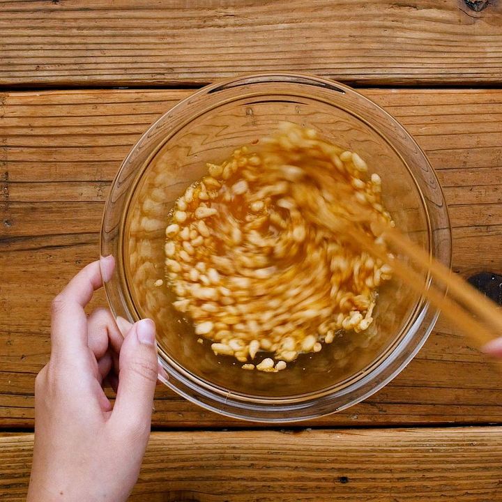 1: ボウルに卵、だしの素、めんつゆを入れて混ぜ合わせ、天かすを加えて混ぜ合わせます。