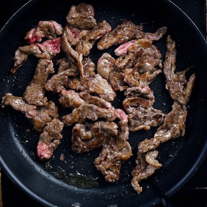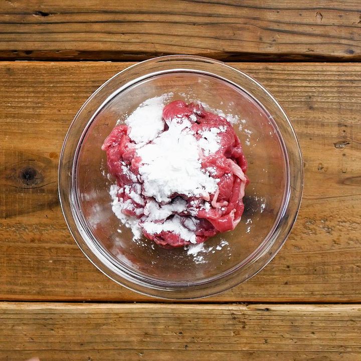 牛肉に酒と片栗粉を揉み込むことで、旨みを閉じ込め、かつしっとりやわらかく仕上がります。