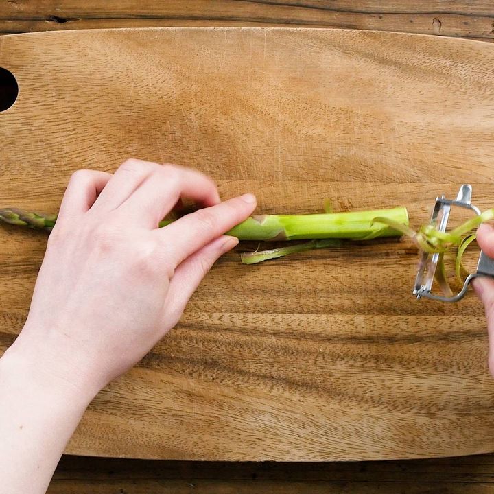 1: アスパラは根本をピーラーでむいて固い部分を落とし、3cm幅の斜め切りにします。