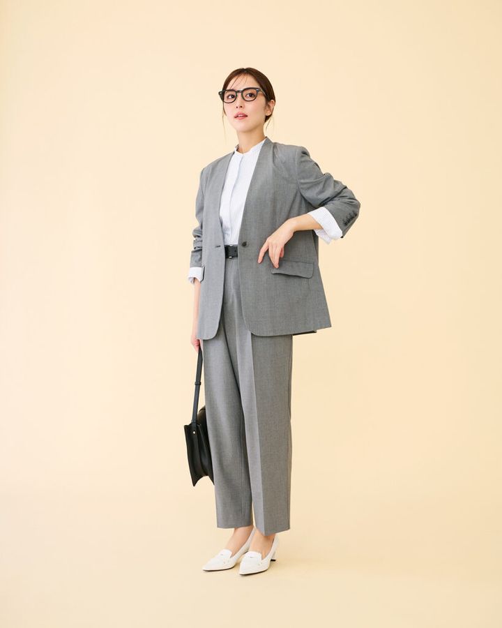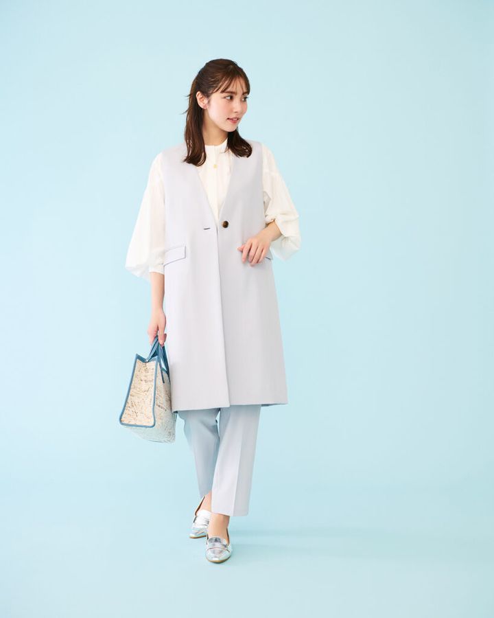 膝丈のジレとパンツのセットアップは着るだけで颯爽とした印象に。優しげなパステルカラーながら、忙しい業務も笑顔で乗り切れそうなタフさも覗きます。ジレ¥12,100パンツ¥10,890(ともにビーミング by ビームス/ビーミング ライフストア by ビームス ららぽーとTOKYO-BAY店)ブラウス¥19,800(ボールジィ/TOMORROWLAND)バッグ¥58,300(ア ヴァケーション)ローファー¥18,150(ダイアナ/ダイアナ 銀座本店)ネックレス¥50,600(ココシュニック)