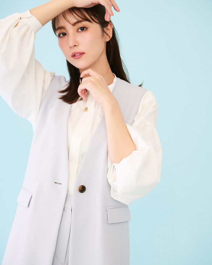 インナーに合わせたのは、袖口にふんわりとしたボリュームのあるブラウス。どんな所作でもエレガントに見せてくれるトップスは、きちんと見せたい場面はもちろん、日常でも活躍すること間違いなし。