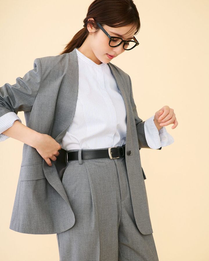 タック入りパンツならベーシックなスーツよりもハンサム顔に。ストライプのバンドカラーシャツをパンツにINし、太めのベルトで引き締めたら、忙しく動き回ってもキリリとしたカッコ良さをキープできる。