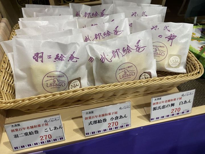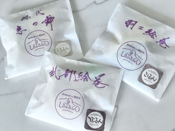 今回紹介するのは、福井県越前市にある老舗和菓子屋「木津屋」がつくる、羽二重餅を使用したお菓子。つぶあんの「式部絵巻」、こしあんの「羽二絵巻」、しろあんの「源氏恋の舞」の3種類があります。価格は各270円(税込)です。