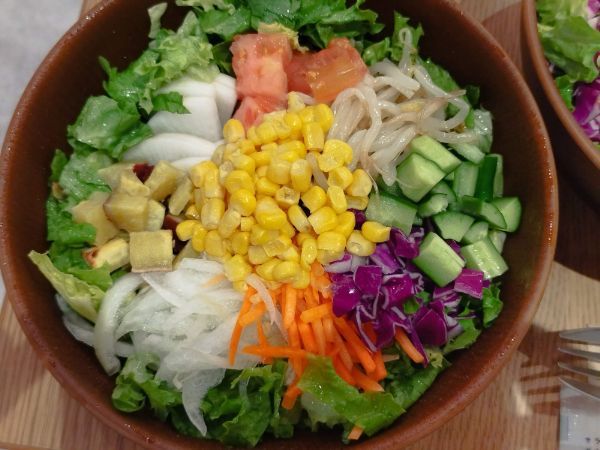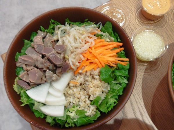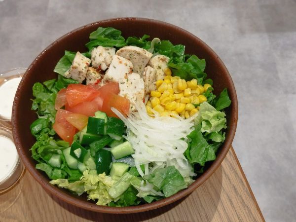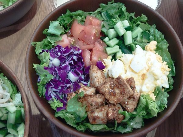 10種の野菜が入った1日分のまるごとサラダ(S¥1,290 M¥1,390 L¥1,490)。これ1杯で1日分350gの野菜がとれるそう。 グッド、バランス!