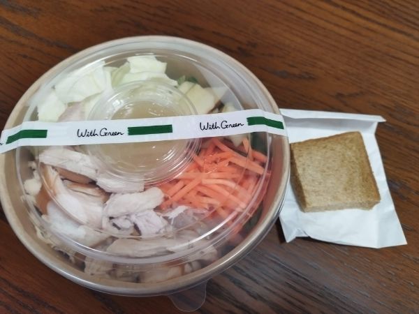 本日は、試食としてサラダボウル、テイクアウトさせていただきました。 こちらも春限定「春キャベツとスモークチキンのサラダ」(S¥1,290 M¥1,390 L¥1,490)実食です。