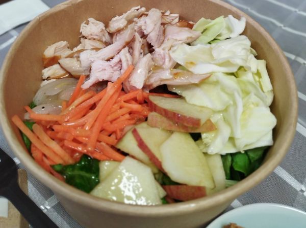 おすすめドレッシング「柑橘」が、爽やかです。 春キャベツ、甘みがあって、柔らかい。オニオンマリネの酸味が、良いアクセントになっています。リンゴ、シャリっ、酸味と甘み。人参、歯ごたえありますが、甘みがあります。 スモークチキンが、けっこうボリュームあるんですよね。コクがあって、香りが食欲そそります。このスモークチキンが、柑橘ドレッシングと絡むと、ローストチキンのオレンジソース的な、ゴージャスな味わいになってます。 ドレッシングにとろみがあるので、野菜と絡んで美味しさを引き立てるんですね。 これは!主食になりますねっ。サラダは副菜じゃなく、主役になれる!と発見しました。
