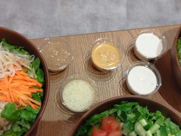 ドレッシング。柑橘、ごま塩、ハニーミルク、レモン、ナッツなどいろいろある中から選べるそうです。嬉しいね。種類ごとのおすすめドレッシングも教えてもらえます。
