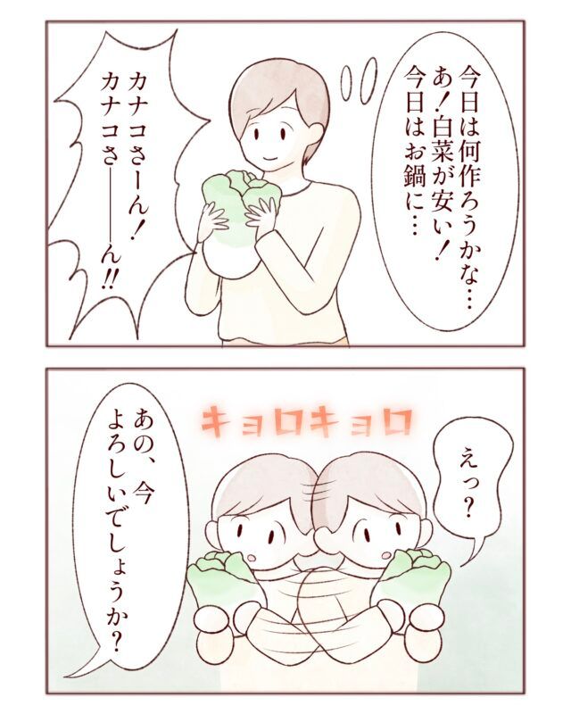 「今日は何作ろうかな・・あ!白菜が安い!今日はお鍋にしようかな・・」