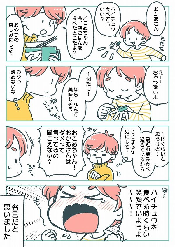 ある日、朝ごはんを食べたすぐ後にハイチュウを食べたいと持ってきました。普段ならおやつの時間まで待てるはずが、その日はよっぽど食べたい気分だったのでしょう。正直に申告するところがまだまだかわいいのですが、最近甘いお菓子が続いていたのが私は気になっていました。やんわりと退けても食い下がる娘に厳しい顔を向けたら、とんでもない名言が出たのです。