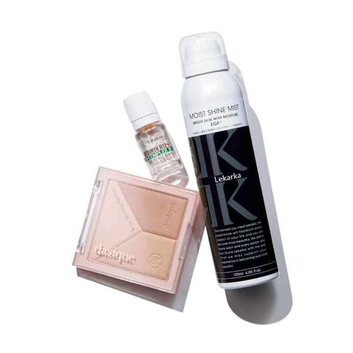 [右から]「手軽に本格的な保湿&美白ケアが叶う霧状スプレー」ブライトリーモイストシャインミスト120㎖¥7,920(レカルカ)「韓国で流行中のドイツ製ビタミンアンプルで朝からエネルギー全開に!」VitabaumビタミンB12+V-Complex 8(30EA)¥16,000(BELLE SHOP Qoo10店)、「韓国のメークさん直伝♡」デイジークブレンディングシェーディング 02¥2,190(Dasique Official Qoo10店)