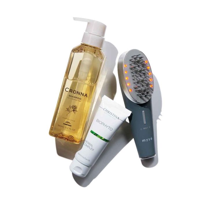 [右から]「バスタイム中にとかすだけ。濡れた状態で使えるので扱いが楽!」スカルプリフト アクティブ プラス¥59,400(ヤーマン)「サリチル酸入りの角質ケアマスクでトーンアップ」ビオフィート ハーバルコンプレックス 75㎖¥11,000(CHRISTINA JAPAN)「カラーのもちを高める最強シャンプー!2週間は延ばせます」クロナ シャンプー フォーカラードヘア 360㎖¥3,960[サロン専売品](ミルボン)