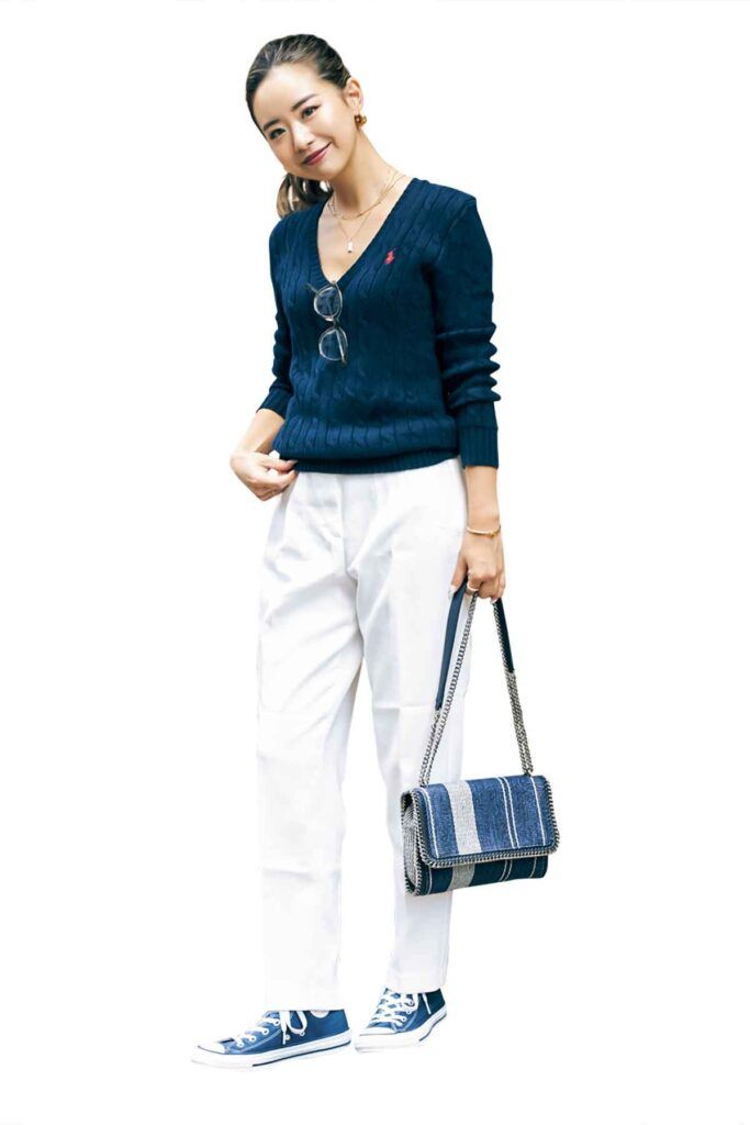 毛玉になりにくいケーブルニットはつい何色も集めてしまいます。着痩せする縦長のVネックは肌見せ面積が広い分、ネイビーで上品にまとめました。