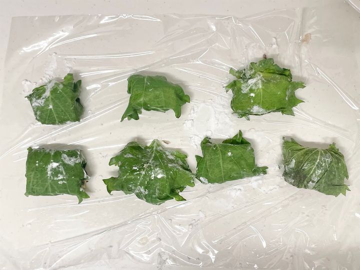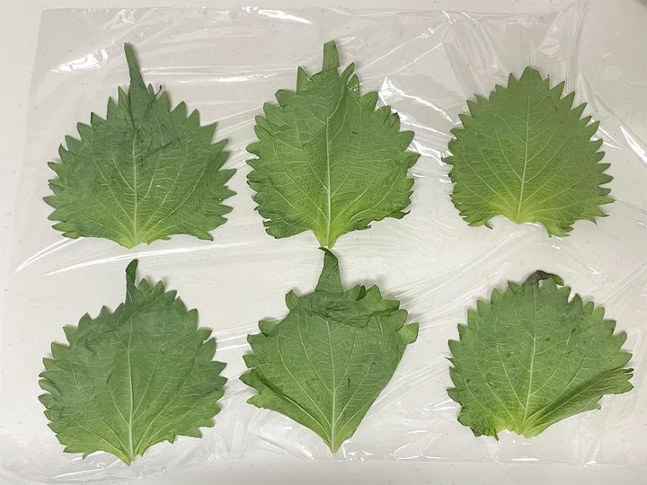 1.ラップを広げ、青じそを並べます。