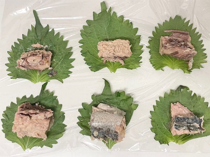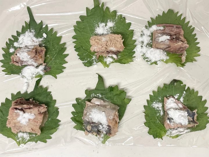 4.青じそでさばを包みます。