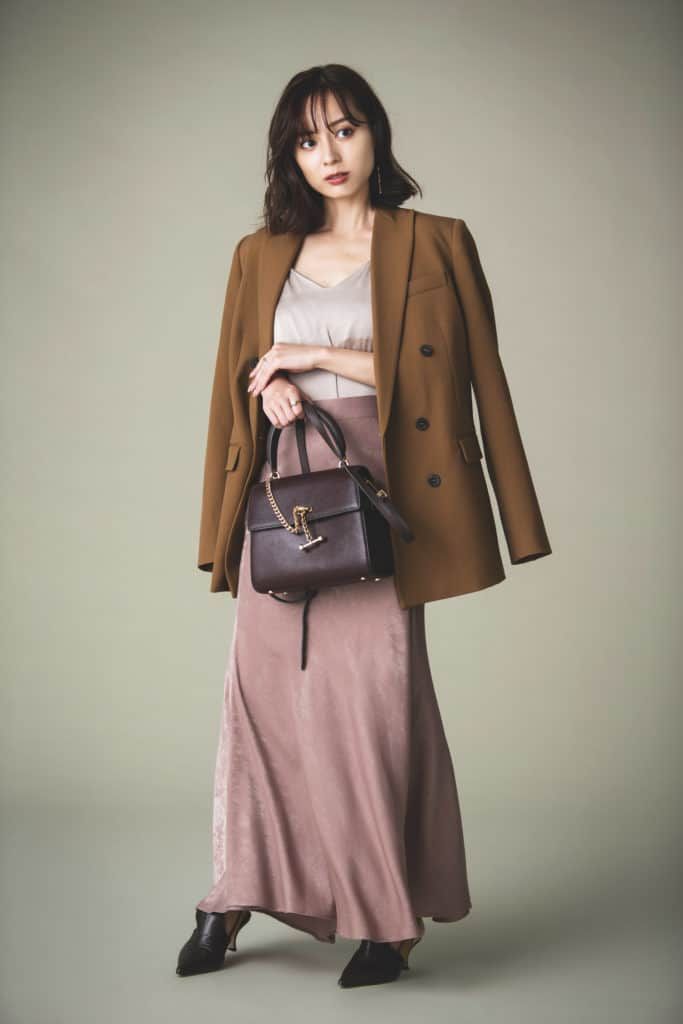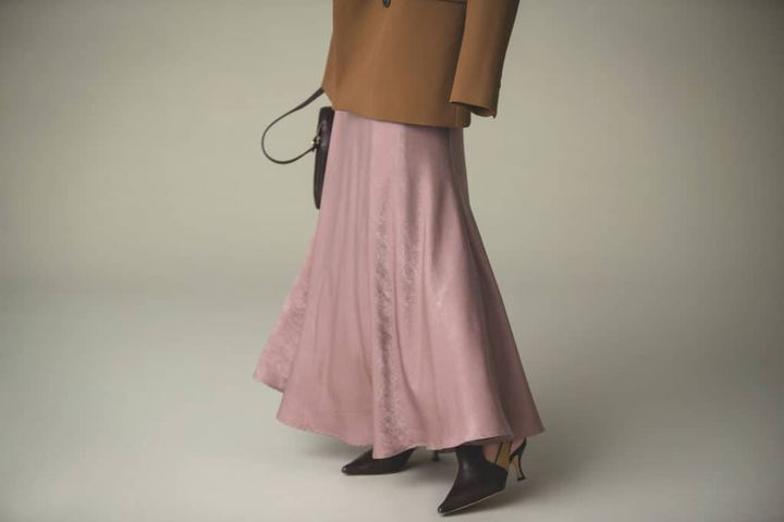 トレンドアイテムの中でも特に注目しているのが、ツヤがあってストンとオチ感のあるサテン地のスカートです。この素材なら可愛い色味を選んでも甘くなりすぎないし、ストンと落ちるシルエットで理想のシルエットが叶うのが理由。広がりすぎないマーメイドシルエットに淡いトーンのトップスを選んで、仕上げにかっちりとしたジャケットを羽織ることで少しカッコよさをプラスします。