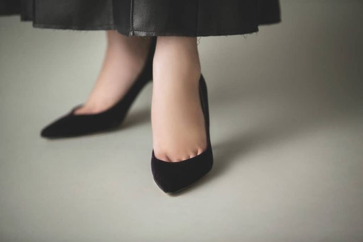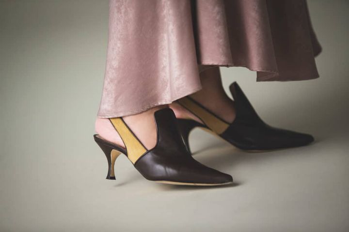 濃いめのバーガンディ色のレザーパンプスをコーディネートして足元をシュッとまとめます。コーディネート全体を引き締めてくれつつ、黒よりは軽い絶妙な色と素材感が特徴で、いろいろなコーデにも合わせやすいんです。