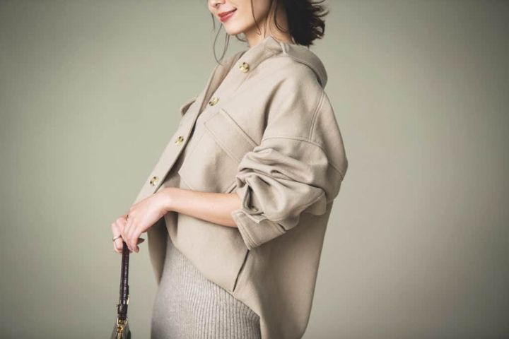 さらりとしたクセのないワントーンスタイルはそれだけで大人っぽく仕上がるのでよく着ています。しかもワントーンはスタイルアップにも有効なので、Sサイズにおすすめの着こなし。特にこの秋冬は、薄めのベージュにブラウンの小物を合わせるのがお気に入り。ワントーン配色のときは、なるべく薄ベージュや薄グレーなど明るめのトーンを選んで、優しい雰囲気になるように気を付けています。さらに、どこかに身体のラインが出るアイテムを取り入れるのがポイント。このコーデだと、ベージュのリブのロング丈ニットスカートがキーアイテム。そして、同じトーンのCPOジャケットを襟抜きして着ることでこなれ感を取り入れています。