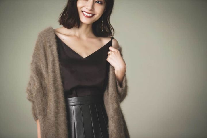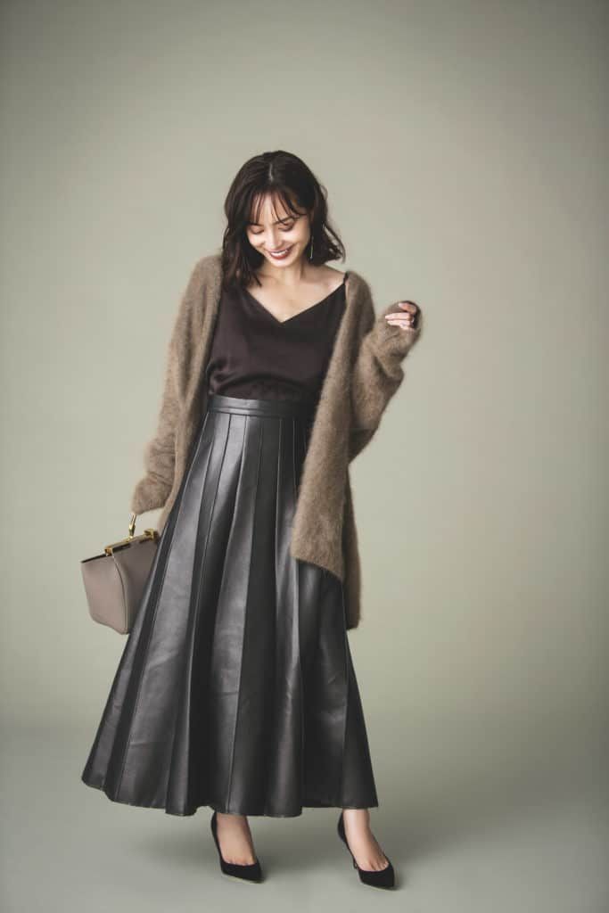 この秋、大ヒット中のブラウンコーデはトーンの異なるベージュやチョコレートブラウンをミックスさせて、メリハリあるスタイルに仕上げます。甘くてコンサバになりがちなモヘアニットだから、ハンサム感のあるレザー調ロングスカートを合わせて大人っぽく仕上げました。インナーもツヤ感のあるキャミソールをスカートにインしてウエスト位置を高く見せているのが小さいけれど重要なポイントです。