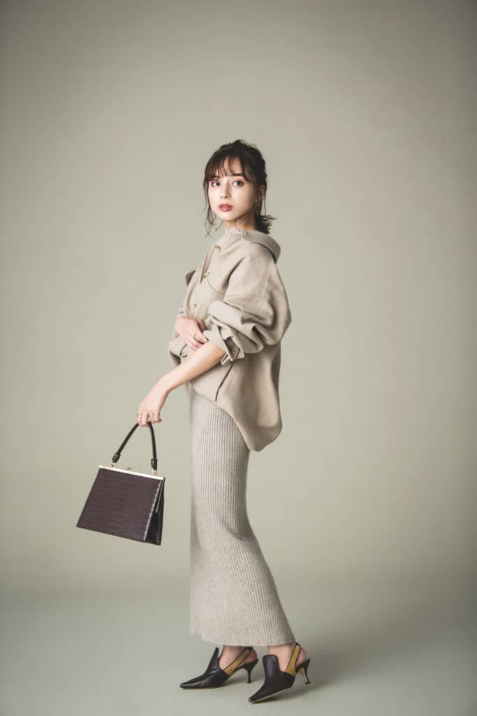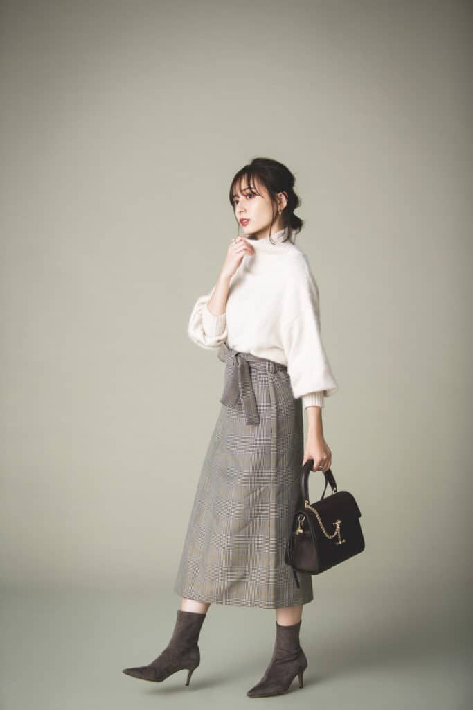 甘めな顔立ちなのもあってコンサバな洋服がつい古く見えてしまいがちなんです。そこでハイネックニットやタイトスカートなどのコンサバなアイテムを着るときは、極力アイテム数や色味を抑えることで大人っぽさをキープしています。今回はニットとスカートだけのワンツーコーデにすること、白×茶の2色に押さえること、さらにデザインもクセのないアイテムを選んでいます。