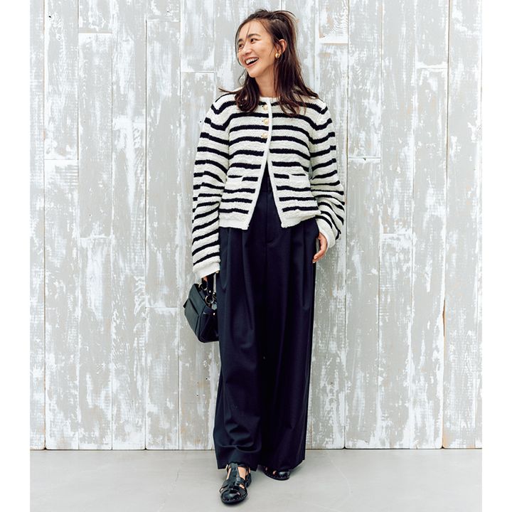上品なツイード調のニットで ボーダーのカジュアル感を払拭。 ジャケット感覚でコーデの主役に