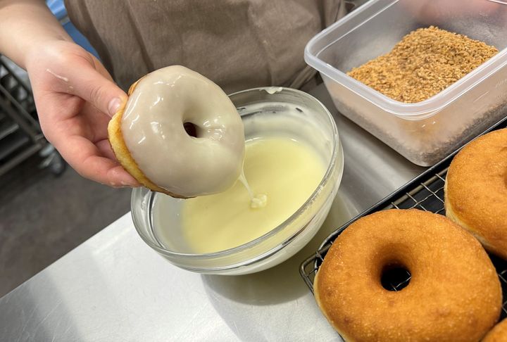 写真は、「ドーナツもり」を代表するドーナツ「オリジナルグレーズ」を仕上げている様子。ドーナツの表面にまんべんなく、ちょうどいい厚さでコーティングするのは、技術がいるのだとか。